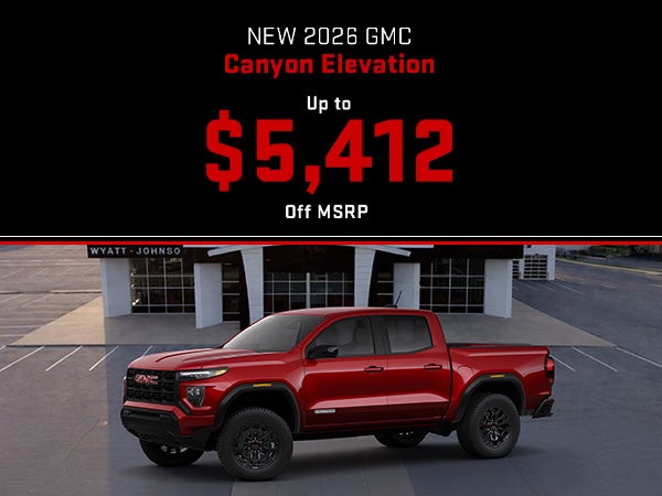 *New 2026 GMC Canyon Elevation VIN 1GTP2BEK1T1100587. MSRP $50,095. Total savings of $5,412 off MSRP includes $750 in available manufacturer rebates, $2,665 Wyatt Johnson Dealer Discount, and $2,000 Conquest Cash for current owners of a 2012 or newer non-GM vehicle; eligible vehicle does not need to be traded. Includes all applicable incentives. Not all buyers will qualify. On select models. If provided, Advertised Price EXCLUDES all optional dealer offered items, accessories, or product addendums optionally selected by the purchaser, dealer document processing fee of $797 per TCA 55-17-114, and state and local taxes, tags, registration, and title fees. Advertised prices INCLUDE factory-installed options and non-optional dealer-installed accessories present at time of advertising. See dealer for details. Offer expires 05/01/2026.