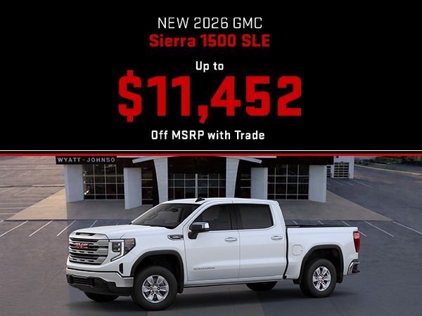 *New 2026 GMC Sierra 1500 SLE VIN 3GTPUBEK2TG218594. MSRP $56,140. Total savings of $11,452 off MSRP when trading an eligible vehicle includes $3,500 in available manufacturer rebates, $4,452 Wyatt Johnson Dealer Discount, and $3,500 Trade Assist. Trade Assist requires trade-in vehicle; trade value and eligibility subject to dealer evaluation. Includes all applicable incentives. Not all buyers or vehicles will qualify. On select models. If provided, Advertised Price EXCLUDES all optional dealer offered items, accessories, or product addendums optionally selected by the purchaser, dealer document processing fee of $797 per TCA 55-17-114, and state and local taxes, tags, registration, and title fees. Advertised prices INCLUDE factory-installed options and non-optional dealer-installed accessories present at time of advertising. See dealer for details. Offer expires 05/01/2026.